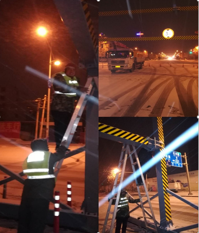 深夜12點(diǎn),騰盛公司接到通知,為了確保道路安全暢通,養(yǎng)護(hù)施工人員要在須水立交橋撒完融雪劑,因上橋口有限高架,撒融雪劑車輛無法上橋作業(yè)。隨后,騰盛公司生產(chǎn)部副部長(zhǎng)校宗帥帶領(lǐng)三名員工,立即起床,帶上施工工具,立即出發(fā)。凌晨1:30分左右,達(dá)到須水立交橋,此時(shí)雪已經(jīng)下大。警示標(biāo)志擺放到位后,工人們頂風(fēng)冒雪,進(jìn)行施工。一名人員負(fù)責(zé)保通工作,其他三名人員對(duì)限高架進(jìn)行升高調(diào)整。雖然穿著棉襖,戴著棉手套,但在零下10度的深夜,刺骨的寒風(fēng)夾著雪花吹到臉上,如刀割一般,但騰盛公司員工沒有被困難嚇倒,他們不停的忙碌,對(duì)限高架進(jìn)行調(diào)整,在凌晨6點(diǎn)順利完成了限高架的升高工作,確保了融雪劑撒布車正常上橋作業(yè)。