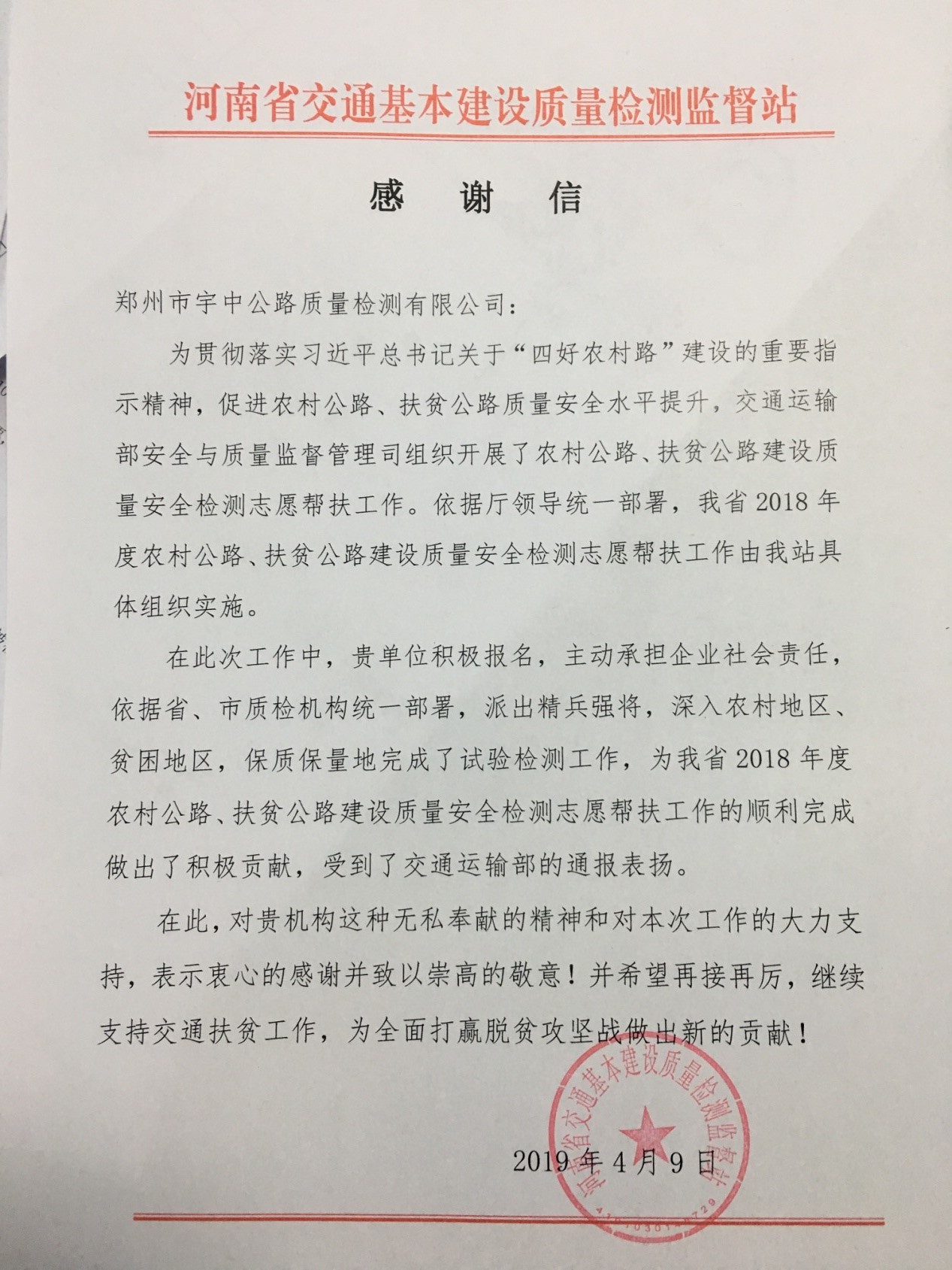 4月22日,質(zhì)檢中心收到了一封來自河南省交通基本建設質(zhì)量檢測監(jiān)督站的感謝信,感謝質(zhì)檢中心在促進農(nóng)村公路、扶貧公路質(zhì)量安全水平提升等方面做出的積極貢獻。