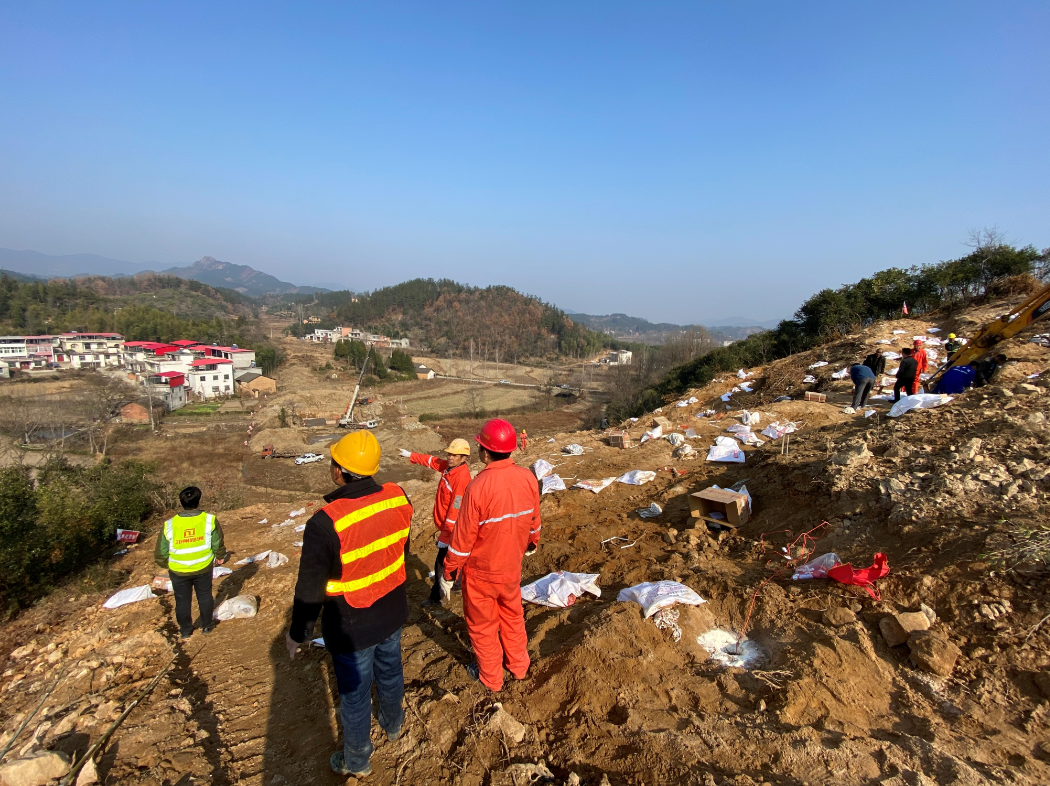 上午9點,我部人員組織炸藥進(jìn)場,布置于柴家沖小橋南部的山體上。本次爆破采用深孔松動爆破方法,使用電子數(shù)碼雷管達(dá)到單孔單爆的效果,降低爆破產(chǎn)生的震動及沖擊波。本次爆破共使用炸藥5噸,共覆蓋山體面積860㎡,炸藥埋深16-22米,爆破獲得土方、石方共13000m3。爆破過程中由項目部牽頭組建安全管控小隊,全范圍保證安全施工,爆破過程中無任何安全事故發(fā)生。