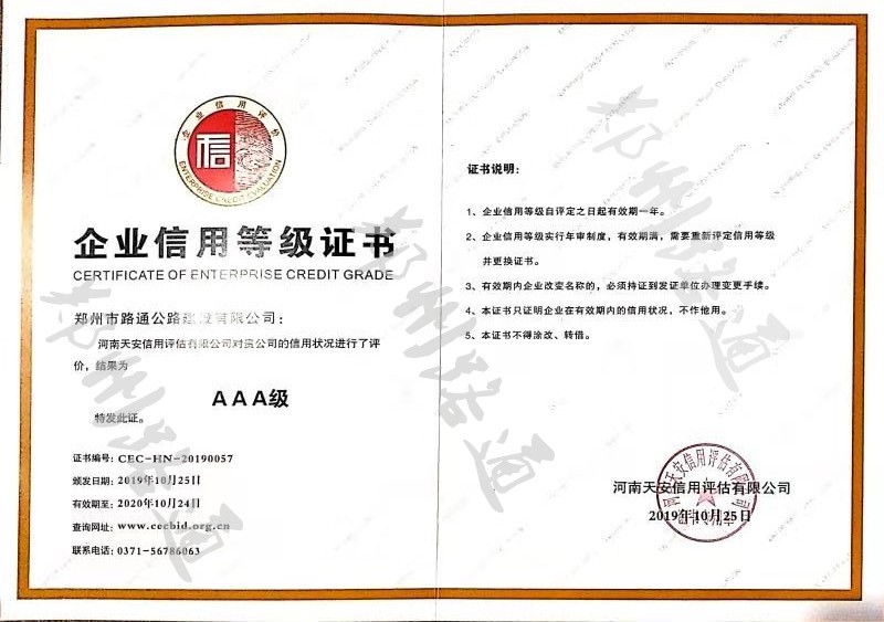 同時河南鑫誠信用管理咨詢有限公司評審的省級企業(yè)信用等級,路通公司也通過了AAA等級。