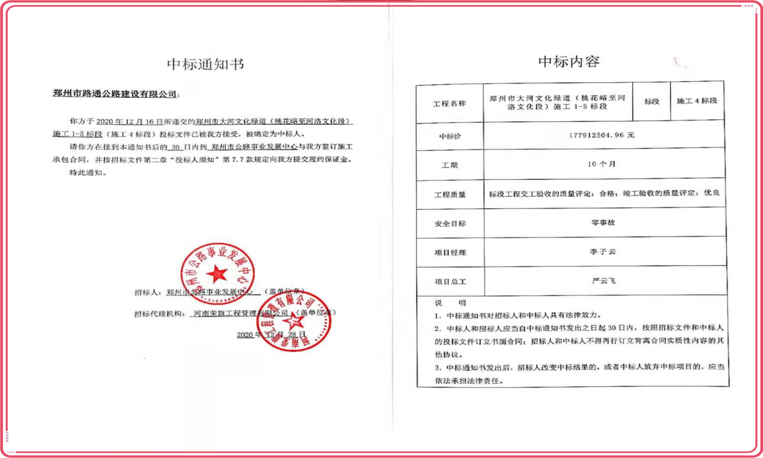 2021年1月15日,在新年到來之際,公司正式收到鄭州市公路事業(yè)發(fā)展中心發(fā)來的《鄭州市大河文化綠道(桃花峪至河洛文化段)施工四標(biāo)段》中標(biāo)通知書,中標(biāo)金額1.77億元。這是我公司2020年度中標(biāo)金額最高的項目。