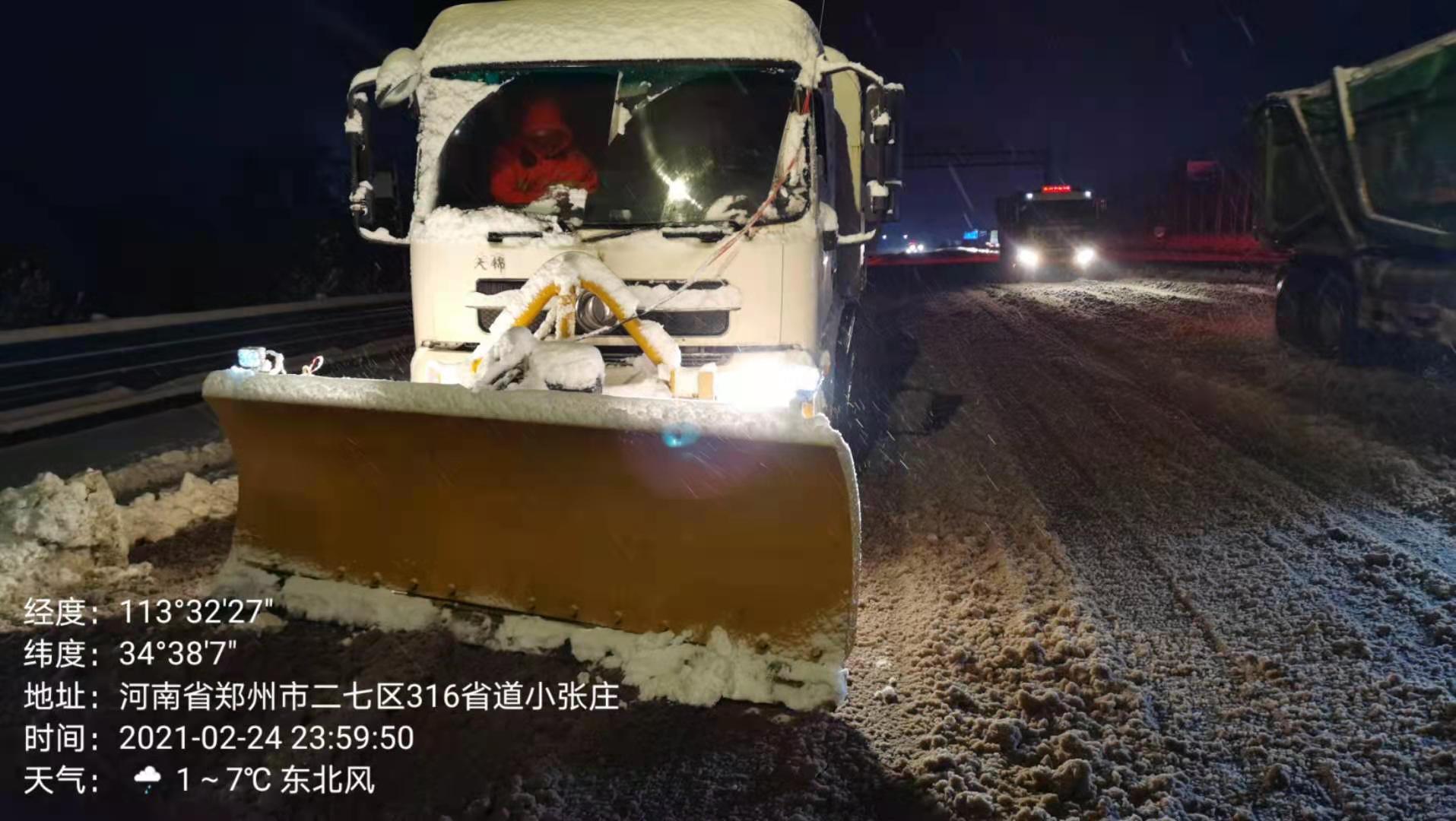 2021年2月24日晚,鄭州市突然大雪紛飛,氣溫驟降。寒風(fēng)如刀,雷電交加,惡劣的天氣卻阻止不了公路人除冰保暢的信念,冰天雪地里,路通以雪為令,緊急啟動(dòng)《公路除雪應(yīng)急預(yù)案》,按照既定工作方針,全力開(kāi)展公路除雪防滑工作。經(jīng)過(guò)一夜奮戰(zhàn),2月25日清晨國(guó)省干線公路和市域快速通道所有公路均可正常通行,全力保障了公路安全暢通無(wú)事故。