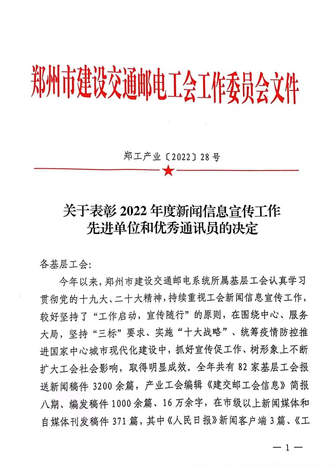 近日,鄭州市路通公路建設(shè)有限公司工會(huì)被鄭州市總工會(huì)交通郵電工會(huì)評(píng)為2022年度新聞信息宣傳工作先進(jìn)單位。