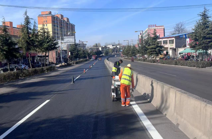 近期,騰盛公司積極組織施工力量,爭分奪秒對公司所承擔(dān)的G343登封段進(jìn)行標(biāo)線施劃。開工前,首先組織專業(yè)人員對標(biāo)線施工涂料用量進(jìn)行核算、備料,積極協(xié)調(diào)施工隊(duì)伍,做好各項(xiàng)施工準(zhǔn)備。作業(yè)現(xiàn)場,嚴(yán)格按照操作規(guī)程,做好道路保通,施工前交底等工作。施工人員使用機(jī)械設(shè)備進(jìn)行劃線作業(yè),此次標(biāo)線施劃采用熱熔標(biāo)線施工工藝,涂料具有干燥速度快、耐磨防滑等優(yōu)點(diǎn)。
