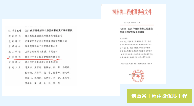 近日,河南省工程建設(shè)協(xié)會公布了2023-2024年度河南省工程建設(shè)優(yōu)質(zhì)工程結(jié)果,由鄭州市宇中公路質(zhì)量檢測有限公司作為第三方檢測單位參建的S317線鄭州境新鄭機(jī)場至新密改建工程新密段項(xiàng)目,榮獲河南省工程建設(shè)協(xié)會“2023-2024年度河南省工程建設(shè)優(yōu)質(zhì)工程”獎。